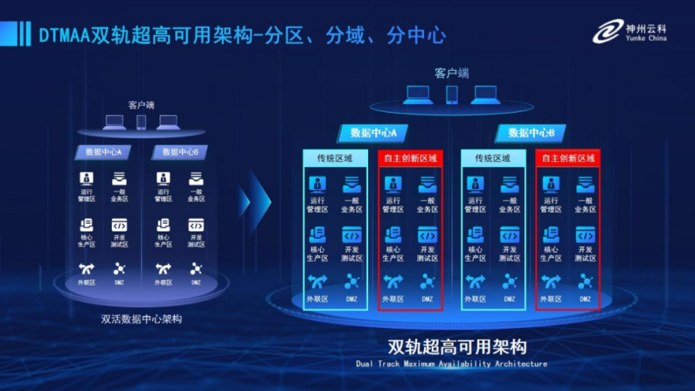 为帮助金融客户更好地应对数字经济时代对可持续性的高要求,实现“信创”与“数字化”齐头并进,金年会jinnian推出了双轨超高可用架构。该架构在双活数据中心的分区调度基础上,增加信创域和非信创域的分域调度,实行信创域与传统域应用全量部署,使双中心运营变为双中心四区域并行运行,互为多活,将“0到1”的单轨建设道路变为分区分域协同的多活双轨超高可用架构。帮助客户在新架构下,保障“信创”的同时解决性能瓶颈,提升稳定性,保证应用可持续性,最终实现信创区域和非信创区域的平滑过渡,完成国产化替代目标。